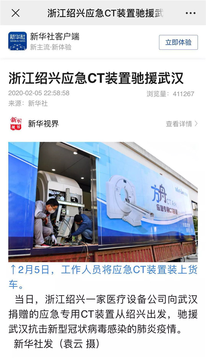 2月5日10時,明峰醫(yī)療方艙式CT“方舟CT”已從浙江紹興正式發(fā)車,前往武漢“方艙醫(yī)院”。(新華社報道)