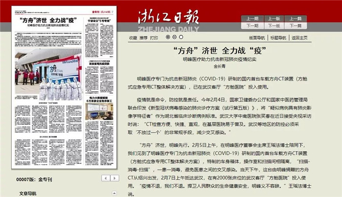 “方舟”濟(jì)世,明峰先行。2月5日上午,在明峰醫(yī)療董事會主席王瑤法博士陪同下,我們見到了明峰醫(yī)療專門為抗擊新冠肺炎(COVID-19)研制的國內(nèi)首臺車載方舟CT裝置(方艙式應(yīng)急專用CT整體解決方案),特制的車身箱體,操作室和掃描間相隔離,“掃描-消毒-掃描”,一患一消毒,避免醫(yī)患之間的交叉感染。當(dāng)天下午,這臺由明峰捐贈的方舟CT從紹興出發(fā),2月7日上午抵達(dá)武漢,在有2000張床位的武漢客廳“方艙醫(yī)院”投入使用。“疫情不退,我們不退。捍衛(wèi)人民群眾的生命健康安全,明峰義不容辭。”王瑤法博士說。