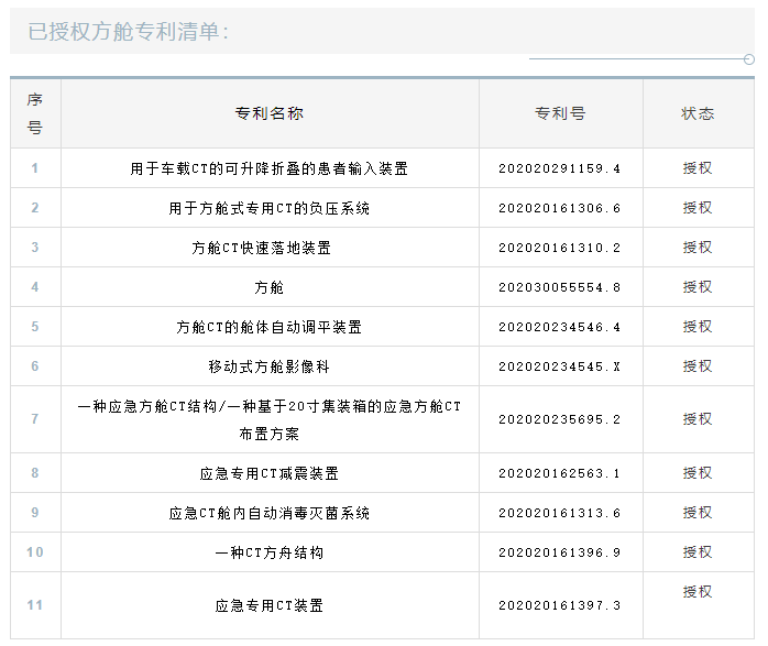 截止目前,明峰醫(yī)療方艙CT系列已獲得11項(xiàng)專(zhuān)利,還有更多專(zhuān)利項(xiàng)目正在審批過(guò)程中。
