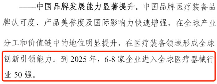 《醫(yī)療裝備產(chǎn)業(yè)發(fā)展規(guī)劃(2021-2025年)》(征求意見稿)在國產(chǎn)品牌發(fā)展能力方面也提出了具體目標(biāo)——到2025年,6~8家企業(yè)進(jìn)入全球醫(yī)療器械行業(yè)50強。