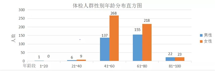 參加本次體檢共839人,平均每天篩查167.8人次,男性321例,女性518例,平均年齡61.2歲。